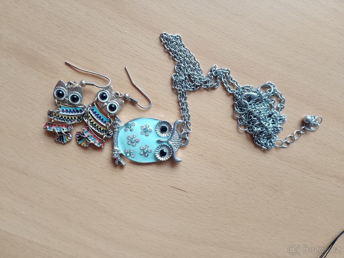 Řetízek a náušnice se sovou ,délka 38 cm