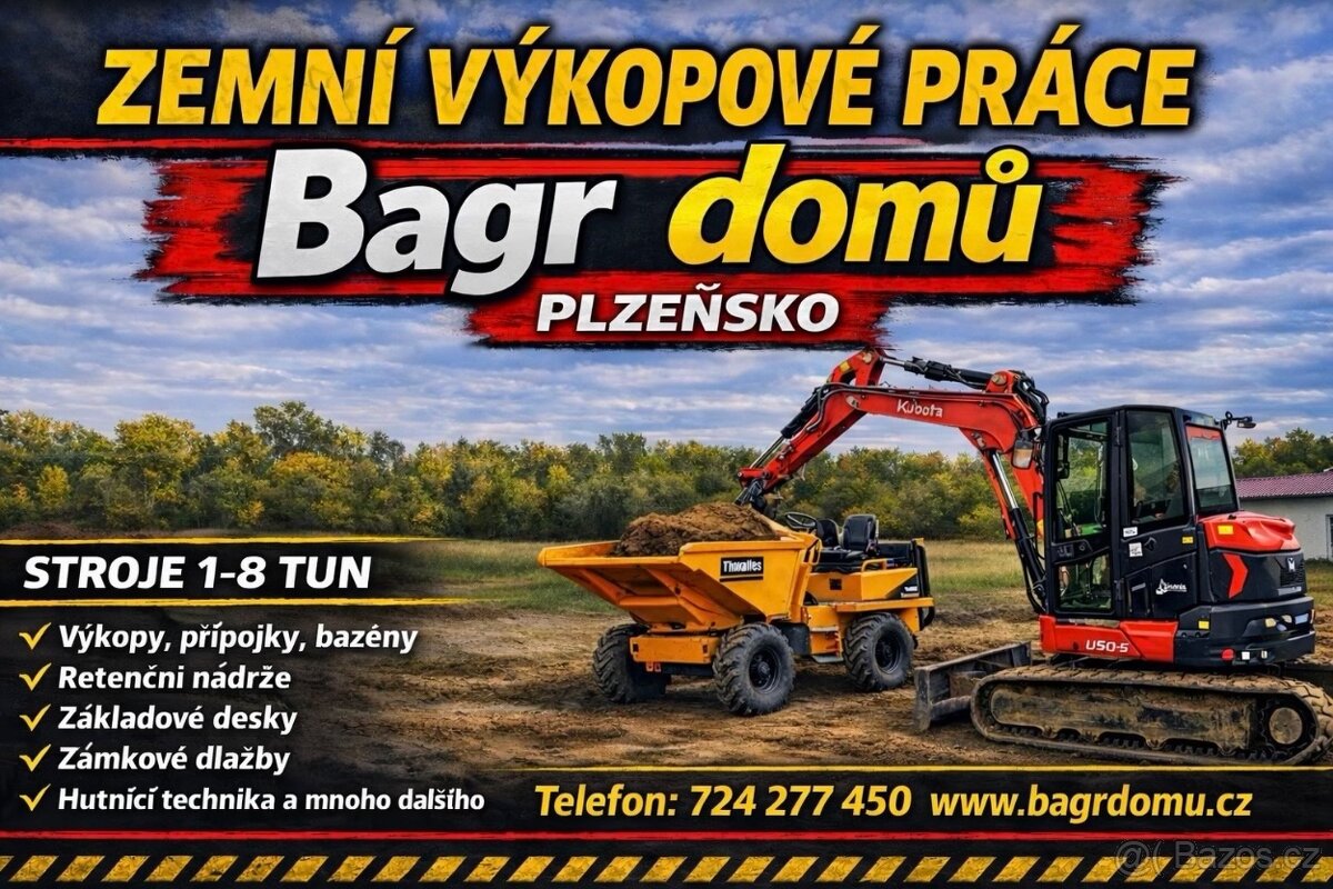Cena: Dohodou. Zemní a výkopové práce – Bagr domů Plzeňsko Sezóna začíná a my jsme připraveni vyrazit do terénu. Bagr domů Plzeňsko nabízí kompletní zemní a výkopové práce se stroji od 1 do 8 tun. K dispozici máme bagry, dumpery i hutnicí techniku – zkrátka vše, co je potřeba pro rychlou a kvalitní realizaci. Zvládneme výkopy pro retenční nádrže, přípojky, bazény, základové desky, zámkové dlažby, modelaci terénu, odvodnění i přípravu pozemku pro trávník. Ať už jde o malou zahradu nebo větší projekt, máme techniku i zkušenosti. Máte před sebou práci a nechcete to dřít ručně? Zavolejte nám. Určitě se domluvíme – když je potřeba kopat, jsme připraveni.