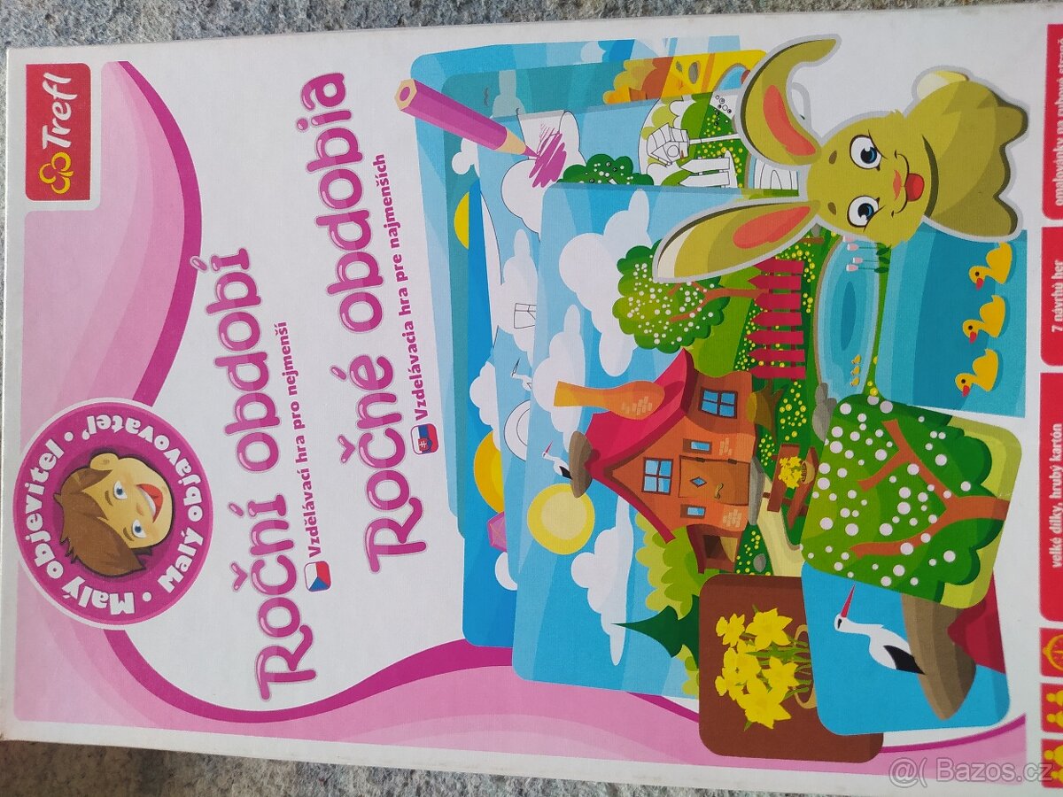 Prodám dětskou hru Roční období (Trefl) pro děti od 3 let. Hra je zaměřená na čtyři roční období a dítě přiřazuje vhodné obrázky, které se nacházejí na ročních kartičkách. Roh u zimní karty je trochu zvohlý, avšak na užití to nemá vliv.