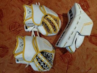 Použité brankářské rukavice Bauer Supreme MACH, seniorská velikost, klasický gard, custom / zakázková výroba, 2x lapačka, 1x vyrážečka, vše game ready /zápasové. Vše ve velmi dobré kondici, obě lapačky plasty a výplně jsou v dobré kondici, včetně výpletu koše, a pevné hrany koše, obě pěkné zavírají, přesně ve své ose. Vyrážečka to samé, plast a výplň v pořádku, rukavice vyrážečky/dlaň bez jakékoliv dírky. Rukavice nejsou nové, tudíž nějaké opotřebení tam samozřejmě je, ale stále dokážou zastat i hokej vyšší úrovně. Preferuji prodej jako celku.