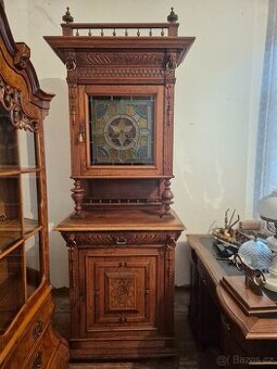 Šířka 90 cm, hloubka 52 cm, výška 245 cm. Lze dělit na spodní a horní část Ručně vyřezávaný starožitný příborník z masivního dubového dřeva, vyrobený přibližně kolem roku 1900 . Je zhotovený v oblíbeném stylu Mechelen (neorenesance) a disponuje originálními vitrážovými dvířky s motivem hvězdy Nábytek je v dobrém stavu, má však jednu drobnou vadu: kousek spodní ozdobné lišty je ulomený (viz foto). Máme pevné ceny !! Osobní převzetí - Toto zboží je v našem skladu v Dašicích u Pardubic. Po domluvě možnost zajistit dopravu pouze do 30 km od Pardubic nebo po Praze ( náklady na dopravu hradí kupující ). PODÍVEJTE SE PROSÍM NA VŠECHNY MOJE NABÍDKY