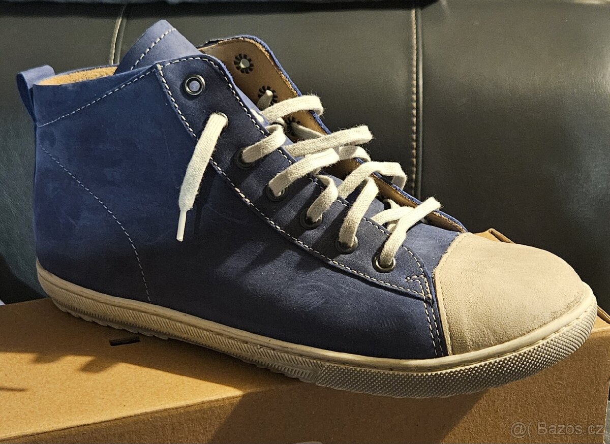 Barefoot boty ve velikosti 40. Jsou z měkké, příjemné kůže v modré barvě s béžovou špičkou. Vnitřek je kožený. Barefoot tvarem – hodně místa pro prsty.
