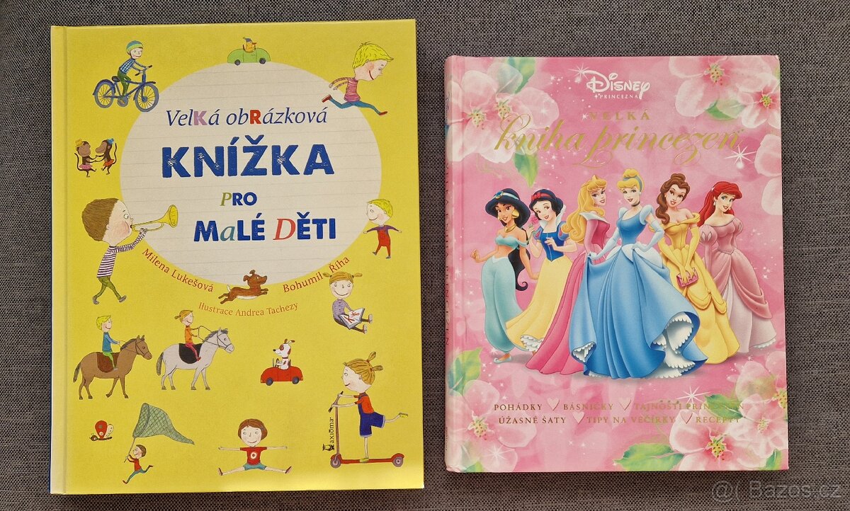 Prodám tyto dětské knížky: Velká obrázková knížka pro malé děti - Milena Lukešová, Bohumil Říha. Kniha obsahuje 500 slov od A do Z a jejich významů a také 500 obrázků.Jedná se o encyklopedii pro předškolní věk. Kniha je v bezvadném stavu. Disney - Velká kniha princezen Kniha obsahuje pohádky (Šípková Růženka, Popelka, Sněhurka, Bella, Jasmína, Ariel), básničky, tajnosti princezen, úžasné šaty, tipy na večírky a recepty. Kniha je bez vad. Cena je uvedena za kus. Doprava dohodou.Mám i další inzeráty.
