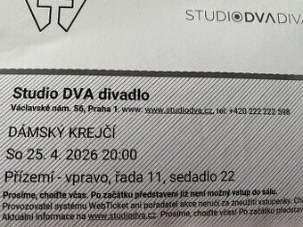 Cena: Nabídněte. Nabízím dvě vstupenky na divadelní představení Studia DVA - Dámský krejčí, 25.4.2026 od 20:00, řada 11, sedadla 22 a 23..PC 2198,-