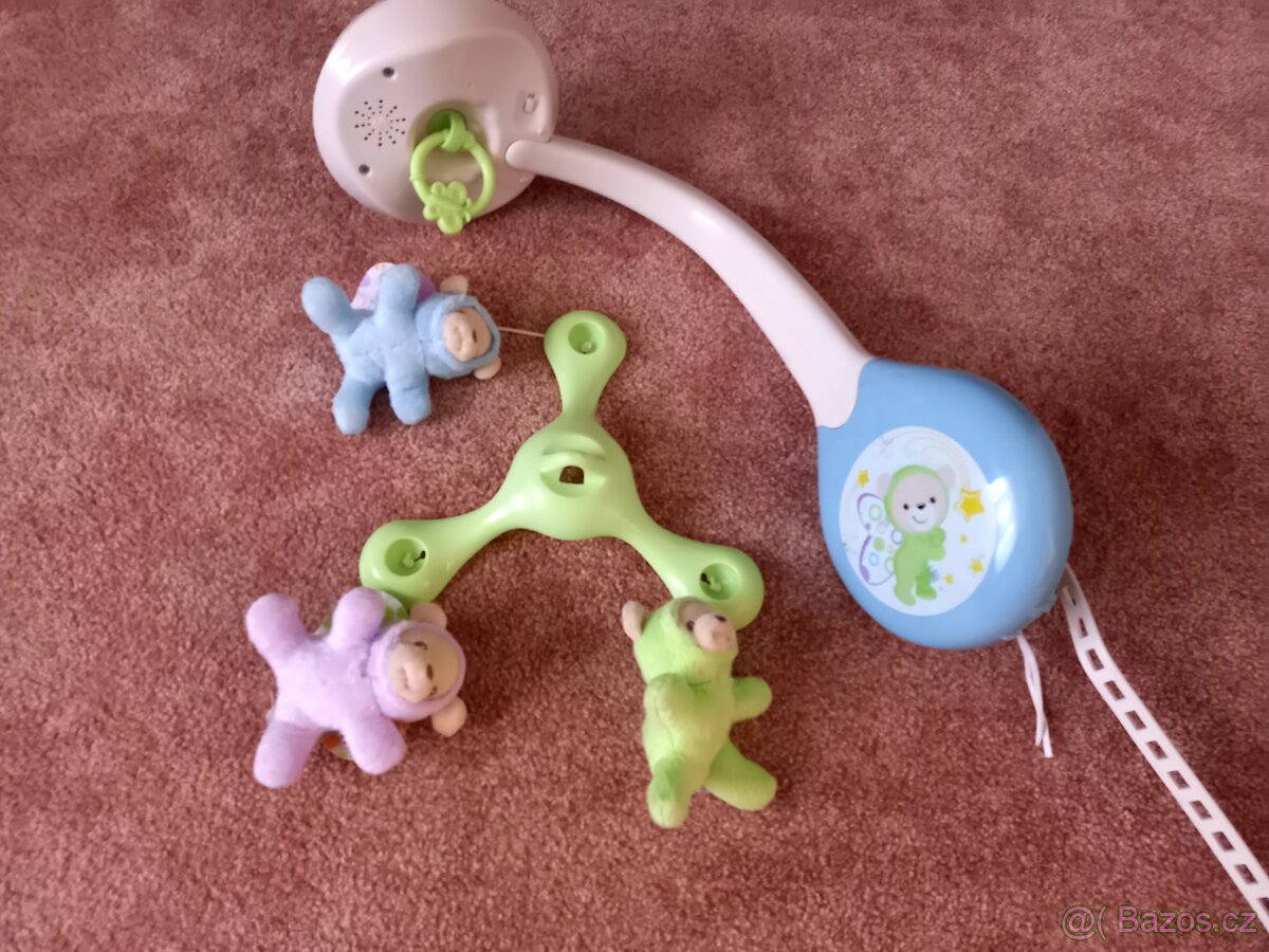 Nabízím ke koupi kolotoč nad postýlku Fisher Price.Možno nastavit 2 hlasitosti zvuku.Hraje ukolébavky a bílý šum, promítá na stropě hvězdičky.Kolotoč lze od postýlky odpojit a možno využít projektor k večerním osvétlení.Barevné označení na tlačítcich jsou používáním sešlé na funkčnosti to však vliv nemá.Chybí pouze dálkové ovládání.Osobní odběr Kateřinice okres Nový Jičín,možná doprava do okolních obcí či zaslat přes zásilkovnu.