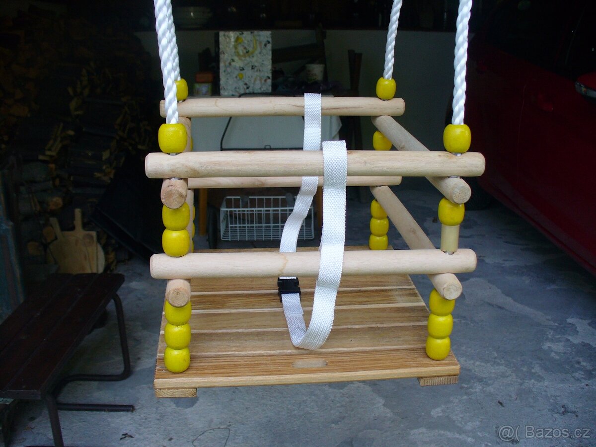 Prodám velmi kvalitní a zachovalou dřevěnou houpačku německé výroby pro vnitřní i venkovní použití. Jeden dřevěný korálek nahrazen (viz foto).