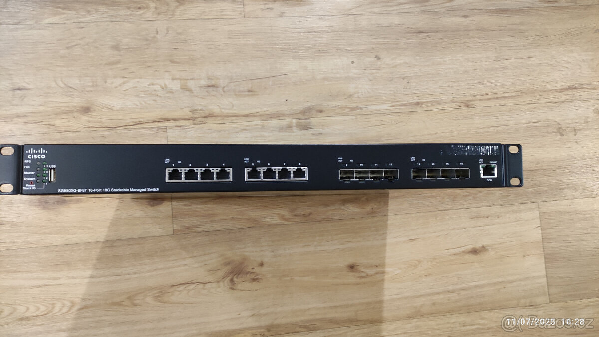 Prodám profesionální switch Cisco SG550X‑8F8T - Model: Cisco SG550X‑8F8T - Porty: - 8× 10GBase‑T (RJ‑45) - 8× 10G SFP+ (optika) - Výkon: Enterprise‑class L3 managed switch - Funkce: VLAN, QoS, L3 routing, stacking, IPv6, bezpečnostní funkce Cisco - Stav: plně funkční, otestováno, vyčištěno - Vhodné pro: firemní sítě, homelab, datacentrum, virtualizaci, Proxmox/VMware prostředí Pouze osobní předání. Nevolat. Odpovídám na email nebo SMS