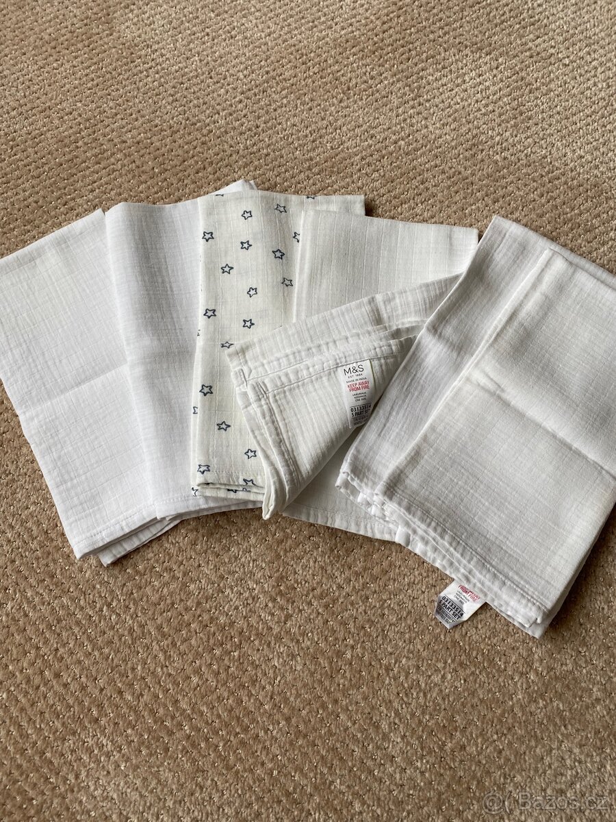 Prodám látkové plenky, 6 ks, 100% bavlna, velmi zachovalé, párkrát použité, některé jen vyprané . Zn. Marks&Spencer.