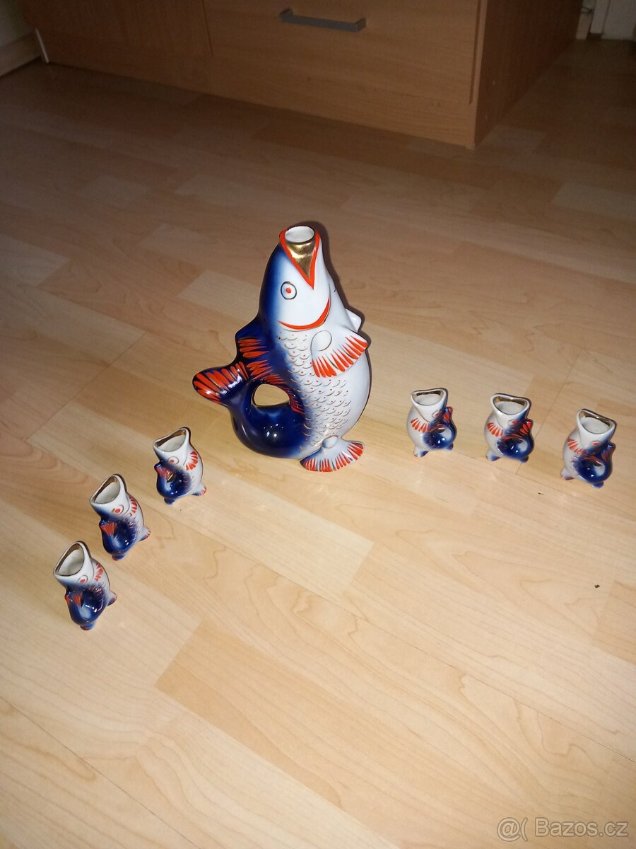 Karafa s frtaňy porcelán, bohužel chybí špunt na karafě jinak super stav.