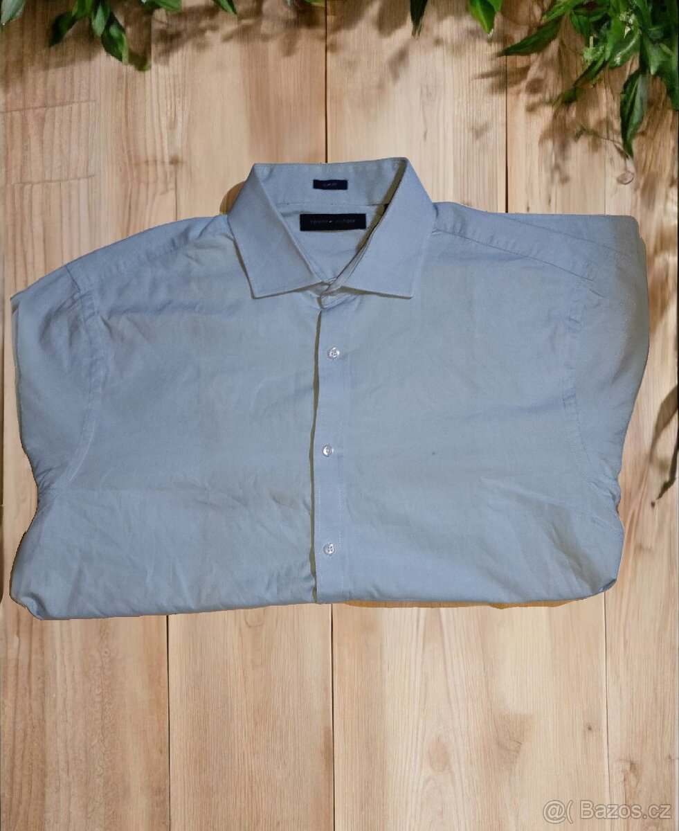 Prodám pánskou světle modrou košili od Tommy Hilfiger. Velikost L Košile skoro nenošená, na jednom místě je mírně spálená od žehličky ale není to skoro vidět. Materiál: bavlna Při rychlém jednání sleva