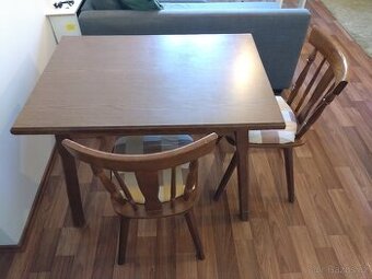 Drevený stôl a dve stoličky sú v dobrom stave. Jedna stolička má len zlomenú tyčku, čo ničomu neprekáža. Rozmery stola: šírka 100 cm, hĺbka 70 cm, výška 72,5 cm. Len osobný odber (Brno-Tkalcovská).