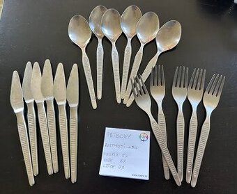 Příbory pocházejí z DDR. Rostfrei Rukojeti mají charakteristický žebrovaný vzor (často nazývaný jako "Linse Muster" nebo "linsenmuster" – čočkový vzor) design 60. a 70. let. Vidličky (Vidličky): 5x Nože (Nože): 6x Lžíce (Lžíce): 6x