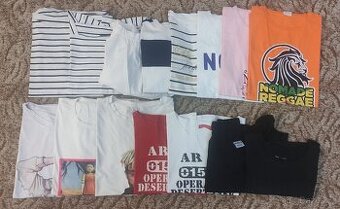 Pořadí dle hlavního fota: 1. bílé s proužky vel.44, lodičkový výstřih, na boku dvě tkaničky pro zřasení, délka od ramene dolů 64cm, šířka od podpaží k podpaží 57cm; 2. bílé s proužky vel.42, délka 57cm, šířka 50cm; 3. halenka nad pas, spadlé rukávy odhalující ramena, vel.40/42 délka 43cm, šířka cca 60cm, spodní guma v klidu 35cm, při max natažení 65cm; 4. triko nad pas vel.M, délka 42cm, šířka 53cm; 5. bílé s proužky nápis be happy vel.L, délka 59cm, šířka 52cm; 6. bílé, nápis Nope, vel.L, délka 62cm, šířka 58cm; 7.+ 8. růžové a oranžové vel.L, délka 65cm, šířka 50cm; 9. obrázek Billie Eilish PRODANÉ ; 10. obrázek squid game vel.M, délka 61cm, šířka 50cm; 11. obrázek XXXTentacion vel.M, délka 61cm, šířka 50cm; 12.+ 13. červené a bílé do pasu, nápis army vel.M, délka 50cm, šířka 46cm; 14. černé nad pas vel.158/164, spadlé rukávy odhalující ramena, délka 42cm, šířka 47cm; 15. černé krátké, pod prsa, vel.psaná XL, ale odpovídá menší (S?), délka 36cm, šířka 42cm. Cena 40,-Kč/ks Mrkněte i n