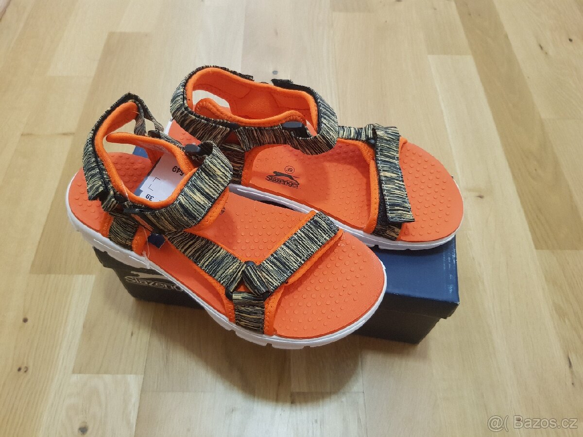 Prodám páskové sandály, značky Slazenger, udávaná velikost výrobcem 39 ( reálně však 37/38 pro nohu 23,5 cm), možnost přizpůsobení skrze 3 nastavitelné pásky, barva oranžová, lehounké. Zcela nové.