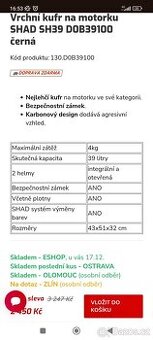 Prodám nový nepoužitý kufr SHAD 39 litrů z důvodu nevyužití.
