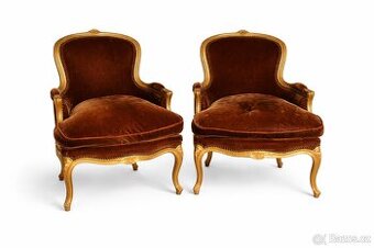 Prodám pár elegantních křesel ve stylu Ludvík XV. Zlacený dřevěný rám, hnědý samet, stabilní konstrukce. Čalounění je původní a vyžaduje vyčištění (případně kosmetické oživení). Vhodné jako designový solitér, do stylového interiéru nebo k renovaci. Osobní odběr, případně dohoda o dopravě. Cena za pár
