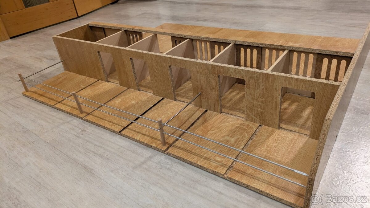 Prodám stáj domácí výroby pro koně v měřítko dle Schleich. Obsahuje 5 boxů + 1 na seno a výběh. Rozměry viz foto.