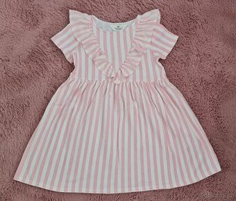 Prodávám něžné dívčí letní šaty, zn. H&M, vel. 122/128. Šaty mají krátký rukáv, pudrově růžové a smetanově bílé pruhy, jsou bavlněné, kanýr je z viskózy. Jsou v perfektním stavu. Rozměry: šíře ramen 27 cm, šíře v pase 36 cm, celková délka od ramen 63 cm, délka samotné sukně 40 cm. Osobní převzetí v Plzni nebo Balíkovna za 85,-, Zásilkovna za 90,-. Zasílám po platbě předem na účet.