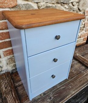 Prodám dřevěný noční stolek se třemi šuplíky,šířka 43,hloubka 35,výška 58 cm,původně přírodní dřevo,nyní po renovaci,natřeno světle modrou barvou,horní deska obroušená a mořená hnědě,nové kovové úchytky. Moc hezký,vhodný do venkovského interiéru. Ideálně osobní vyzvednutí v Předslavi u Klatov,případně možné zaslání po platbě předem.