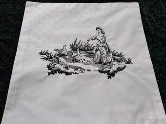 PRODÁVÁM VYŠÍVANÝ POVLAK NA POLŠTÁŘEK - POLŠTÁŘ. 40cm x 40cm, VYŠITÝ ČERNOU NITÍ. NOVÝ, DAMAŠEK - BAVLNA. HOTELOVÉ ZAPÍNÁNÍ. MOTIV MAMINKA + CHLAPEČEK + SLEPICE + KOHPUT + JEZÍRKO. VENKOVSKÝ STYL, DEKORACE DO KUCHYNĚ NA CHALOUPKU. VLASTNÍ VÝROBA.