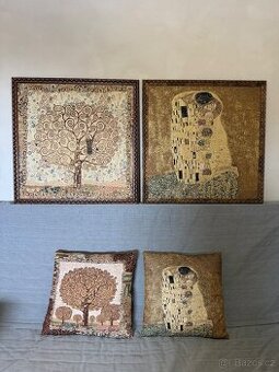 Prodej gobelínových obrazů Gustava Klimta „Polibek“ a „Strom života“ a dvou polštářů ve stejném stylu.