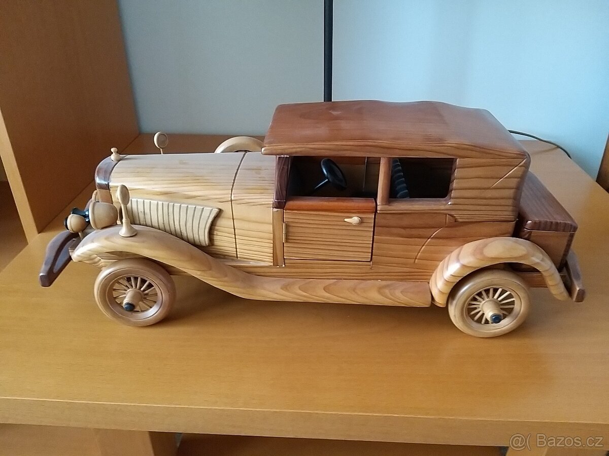Prodám dekorační model auta, vyrobeno celé ze dřeva včetně interiéru, otvírací dvířka a kufr, nepoškozený, délka 50 cm, cena 600 Kč, tel 725 104 081
