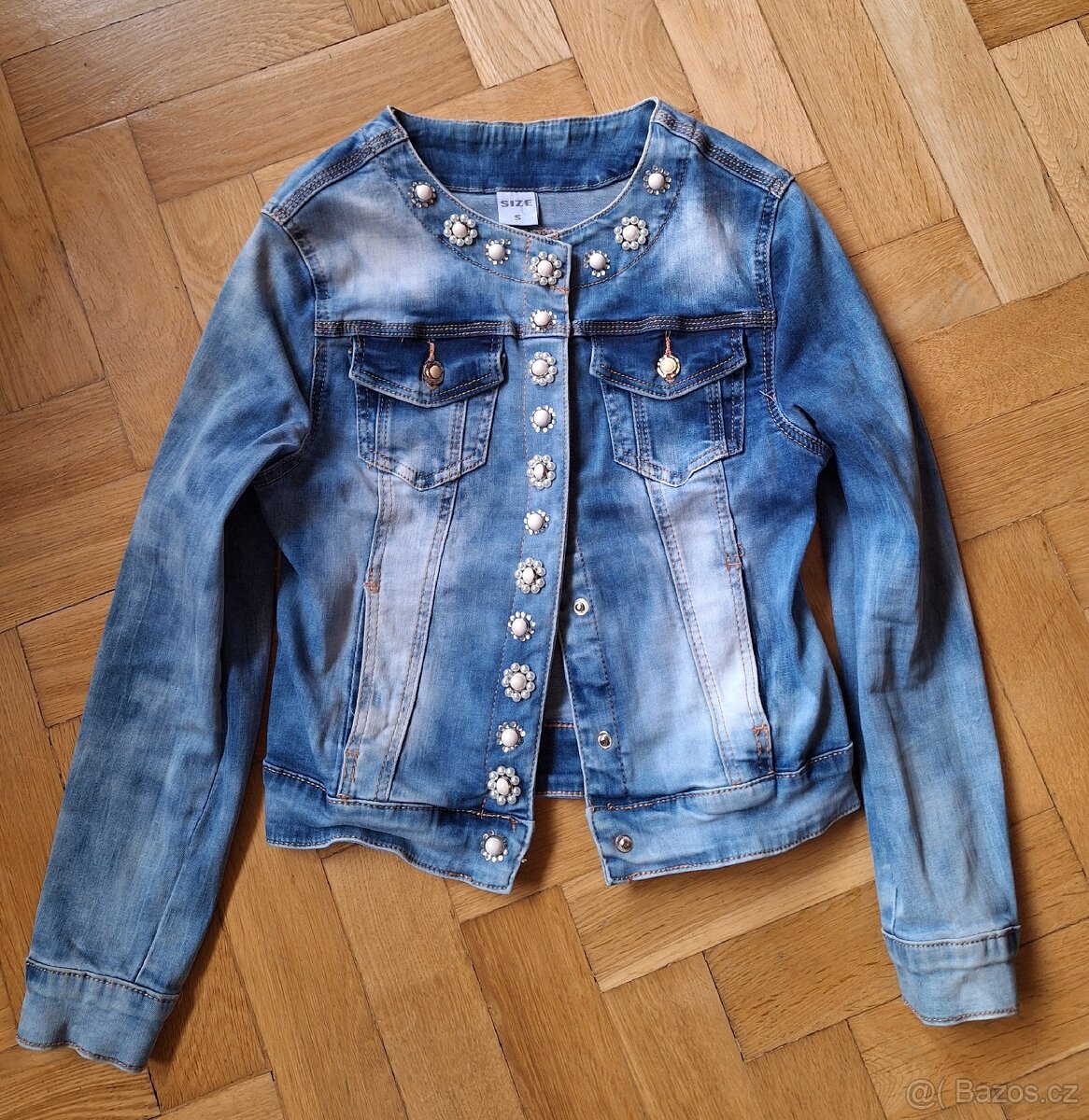 Džínová bunda s perličkami a zirkony. Velikost S. Párkrát nošená.