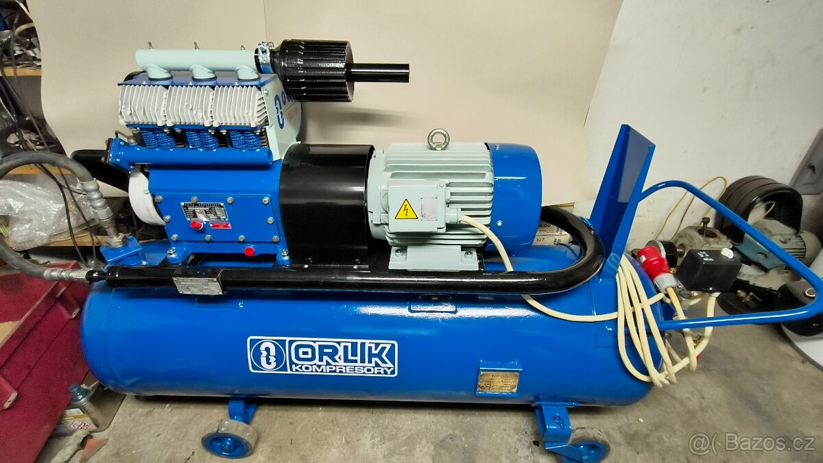 Prodám 3pístový kompresor Orlík, výkonnost 50m3/hod, nádoba 300l, motor 7,5kW. Nainstalován tlakový spínač Condor MDR3 20A s odlehčením, odfukem. Udrží 25A jistič. Kompresor je po kompletní G.O. Možnost dopravy