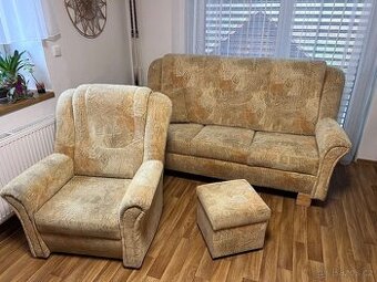 Prodám hezkou pohovku s křeslem. K vyzvednutí v Turnově. Do 50 km mohu dovézt. Cena za vše 3000Kč