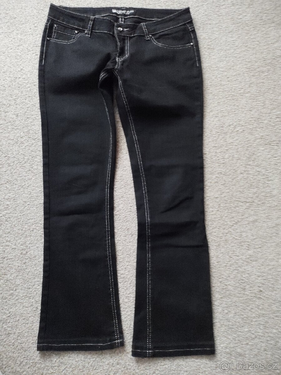 PROSÍM ŘIĎTE SE ROZMĚRY NA POSLEDNÍM FOTU 🙏🙏🙏 Nádherné tmavě černé rifle prošité stříbrnou nití, nenošené jen mi leží ve skříni. Reálná barva a rozměry viz poslední foto
