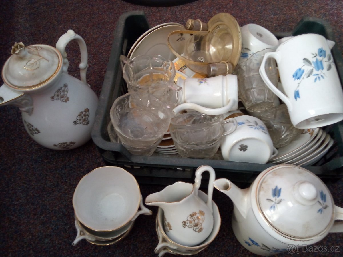 Prodám bednu staršího skla za 200.-Bez sady se zlatým potiskem,pouze věci v bedně a modrá konev.