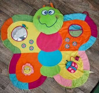 Pěkná hrací deka s hrazdou používaná, ale v pěkném stavu. Rozvíjí dětskou představivost, poznávání barev a tvarů. Hrací deka je v krásné zářivé barvě ve tvaru motýlka. Rozvíjí smysly hmatu, zraku i sluchu díky šustícím a pohyblivým částem. Rubní strana motýlka je z plátna, hlavička motýla je polstrovaný plyš. Příjemný a měkký materiál umožňuje pohodlné ležení na bříšku nebo zádech a umožňuje svobodu pohybu Vašeho dítěte. Hračky lze z hrazdičky snadno sundat i přidat. Hračky lze odepnout a používat samostatně. Vhodné pro děti od 3 měsíců. Rozměry: dxš cca 97x70 cm, výška: cca 49 cm. Cena 150 Kč + POŠTOVNÉ Osobní odběr v Havířově a v Ostravě je vítán.