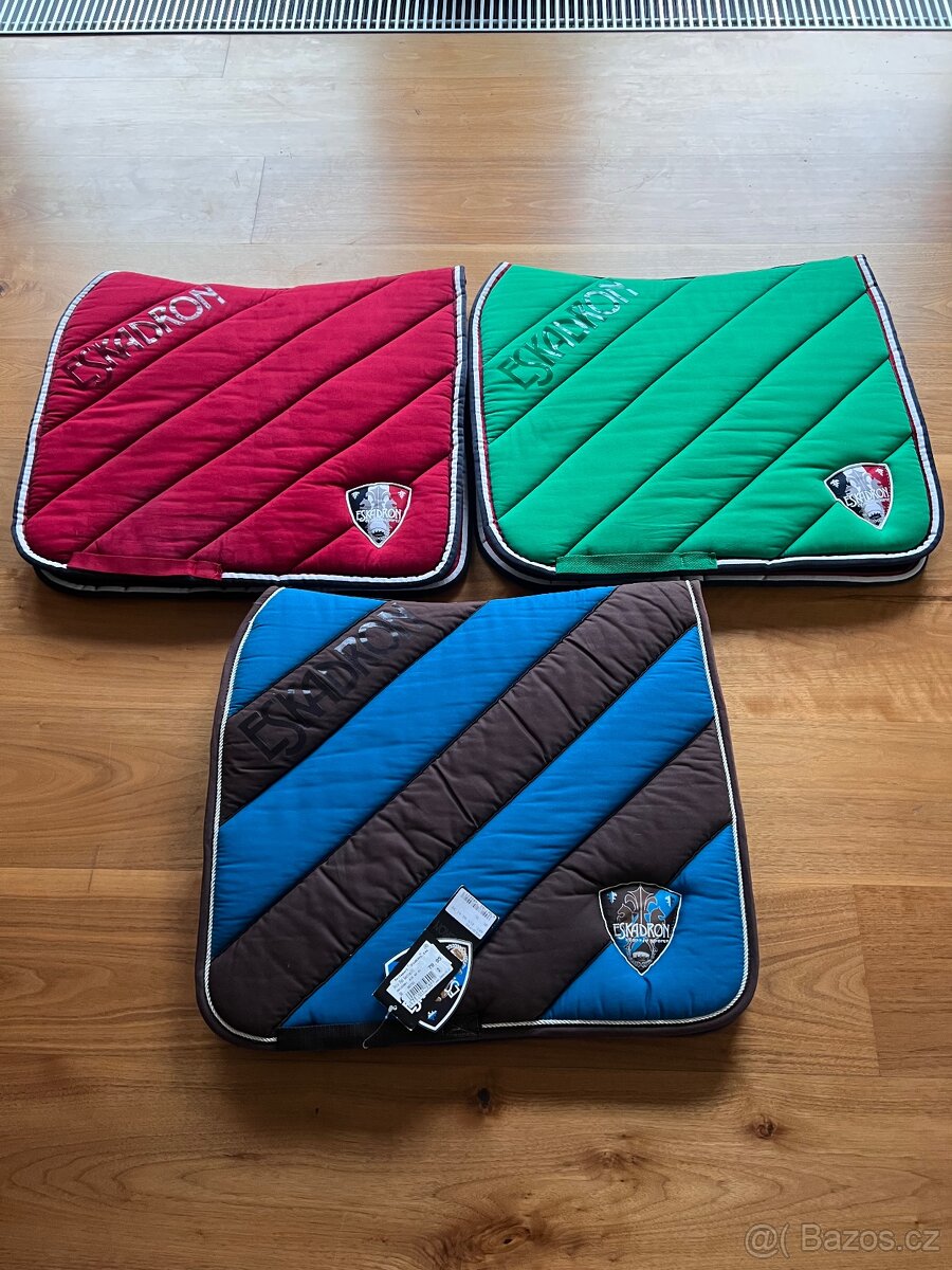 Prodám drezurní podsedlové dečky, značka Eskadron. - Kolekce green/red/ white 2013. Barva GREEN. Dečka 1x na koni, pouze lehce obarvená od sedla, jinak perfektní stav, vypraná. Cena 1200,- - Dečka 4x na koni, vypraná. Kolekce red/ green/ navy 2013. Barva RED. Cena 1200,- - Kolekce CS petrol/ choco/ marone/ creme 2010. Podsedlová dečka choco/petrol, nová s cedulkou (včetně samolepky). Cena 2000,- Osobní předání možné v Praze, Unhošti, Nymburce a Poděbradech. Zasílám přes Zásilkovnu.