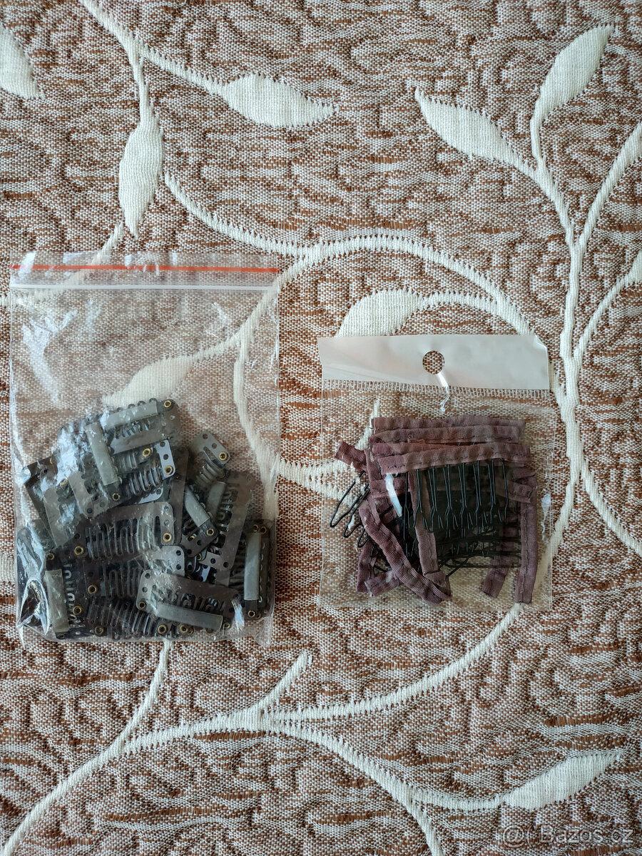 1) 5ks kvalitní hnědá krajková síťka s páskem na suchý zip pro výrobu culíků. 2) 5ks černá síťka pro výrobu příčesků. 3) 12ks vlasový parukový hřebínek. 4) 40ks hnědý hřebínkový clip - sponky pro metodu clip in. 5) Nový clip in příčesek, délka 30 cm, středně hnědá s měděným odleskem. Prodám jako celek za 150 Kč. Bližší info na mailu. Podívejte se i na mé další inzeráty.