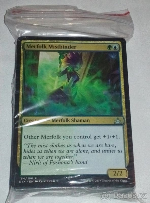Prodám merfolk balíček založený na tokenech. Balík funguje nasledovně: Balíček pokládá na stůl příšery, výtváří tokeny pomocí Deeproot Waters a pak se přes soupeře projede s tokeny posílenými lordy Merfolk Mistbinder a Merfolk Sovereign. Balíček hraje velice dobře proti příšerovým deckům. Byl testován proti Duel Decku Jace vs. Vraska, na 5 vítězných her s výsledkem: Merfolk vs. Jaceův deck 5 : 2 Merfolk vs. Vraskin deck 5 : 2 Link na duel deck: https://www.heureka.cz/?h%5Bfraze%5D=duel+deck+jace+vraska Oba duel decky stojí dohromady téměř 800 korun (Tzn. cca 400 Kč jeden). Tenhle deck je s přehledem poráží a ještě je levnější. Planeswalkers decky poráží prakticky pokaždé. Decklist: https://www.mtggoldfish.com/deck/1151847#paper Nejlepší karty: Merfolk Sovereign, Wake Thrasher, Overwhelming Stampede (ten stojí stovku)