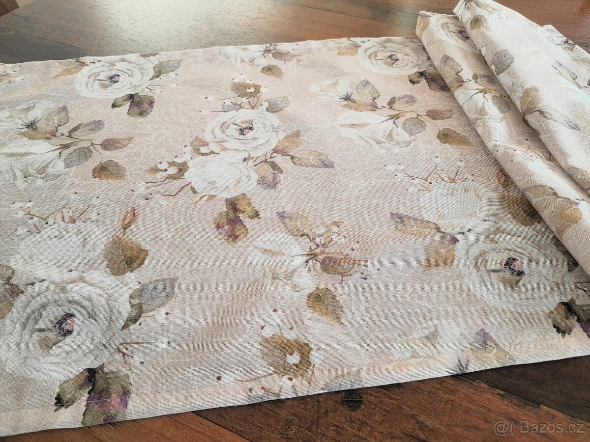 Nabízím středový ubrus, dečku šitou z béžové látky s bílou růží. 180g/m2 50 bavlna 50 PES. Vel. 40x103 cm Materiál je předem vysrážen.