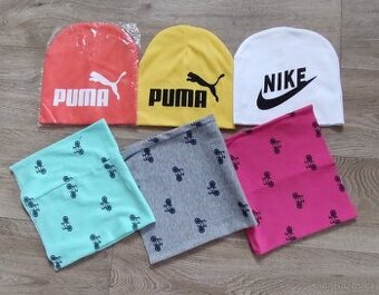 Set pro holčičku Vel. - Uni - 4 - 8 let Krásný set pro holčičku - 3x čepice nové bez visačky, 3x nákrčník v pěkném stavu ( jen u jednoho nákrčníku povolená nitka)