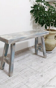 Lavička na bežné používanie z bukového dreva. Výrazne patinovaná modro sivá z bielim povrchom. Povrchová úprava lakom. Výška : 43 cm,šírka 21,5 cm, dĺžka 70 cm Celková cena aj s poštovným.