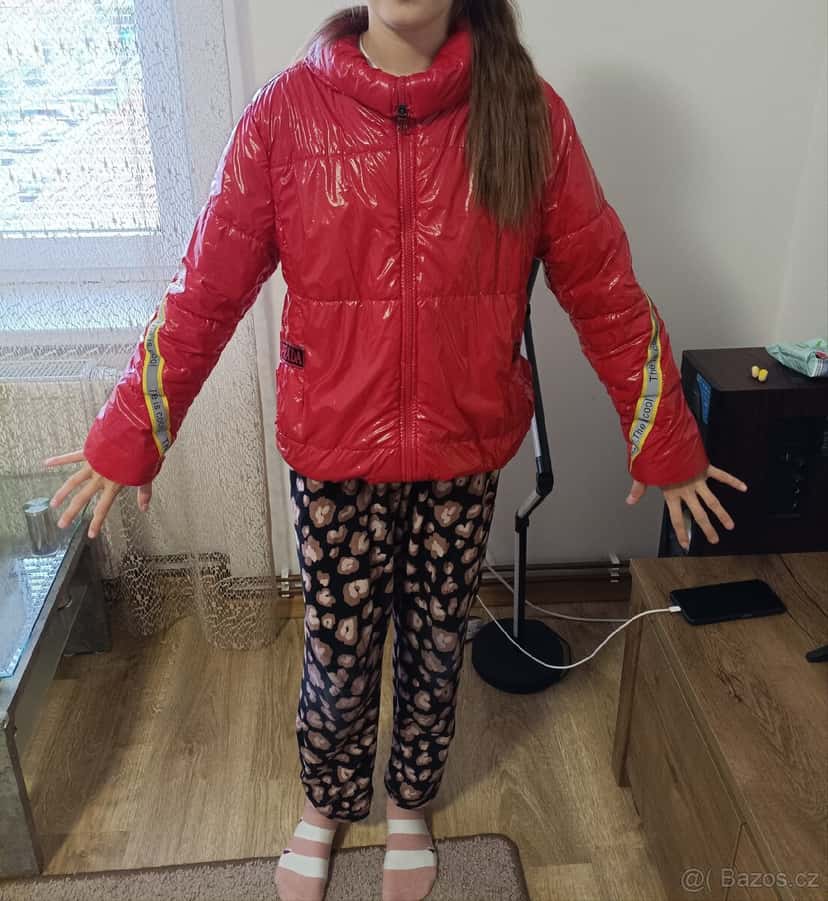 Dětská bunda, červená, polyesterová s lakovaným nátěrem, pro výšku 152 cm, používaná, ale v dobrém stavu.
