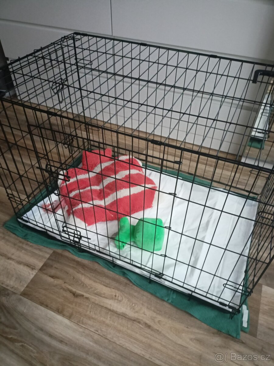 Prodám téměř novou klec, štěňátko v ní spalo sotva 10x. Rozměr 90x56x62 (DxŠxV). Stála 1300. Pouze osobní odběr Kyjov.