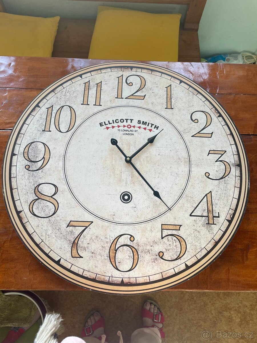 Veliké nástěnné hodiny s nápisem Ellicott Smith London, o průměru 60 cm, retro vintage design ciferníku imitující historické opotřebované dřevo. Strojek na jednu tužkovou baterii, plně funkční