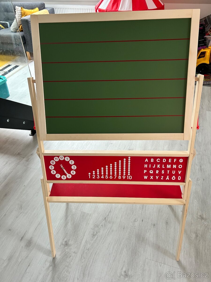 Prodám dětskou oboustrannou tabuli, rozměry: V 115 cm, šířka 70 cm. Z jedné strany magnetická plocha + možnost psát fixem, z druhé strany klasická tabule na psaní křídami. Otočný mechanismus. Spodní naučná část (hodiny, čísla, abeceda) + polička. Smontovaná. Koupena ve Scontu za 1099 Kč, nevyužijeme, přenechám za 499 Kč.