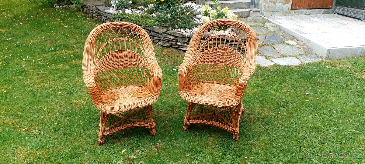 Prodám 2 ks proutěné křesla, rozměry: vyška opěradla 100cm výška sedu 42cm, hloubka 60cm, šířka 70cm. Cena 300 kč/kus.