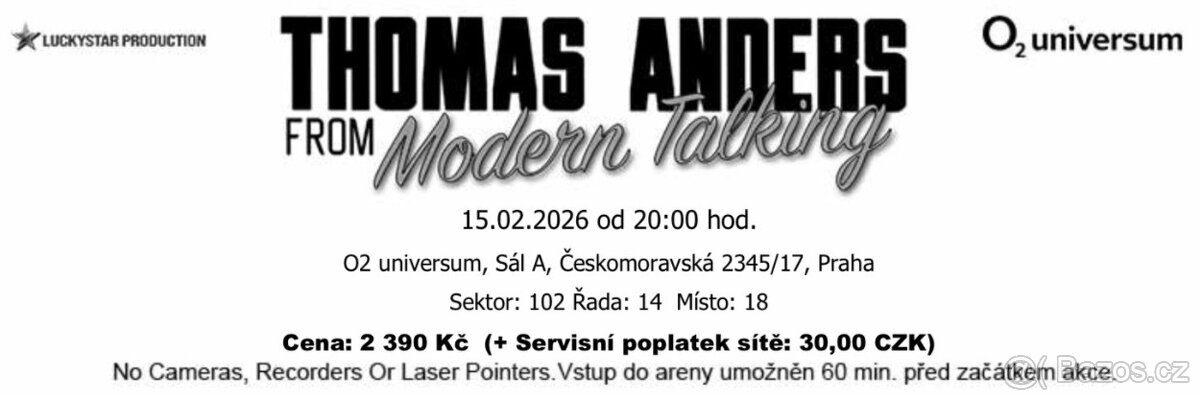 2x lístky na Thomas Anders from Modern Talking - 15.2 v O2 U