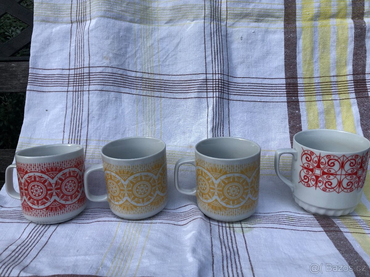 Cena: Dohodou. Pěkné staré hrnky, dva žluté jeden červený vzor mandala a jeden jiný