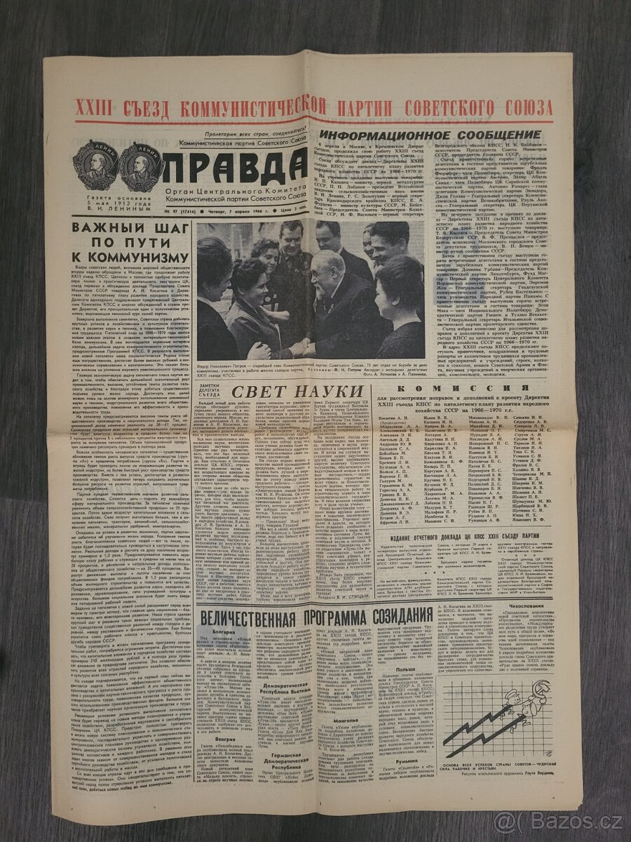 Vydání novin Pravda ze 7.4.1966 Speciální vydání k XXIII sjezdu KSSS