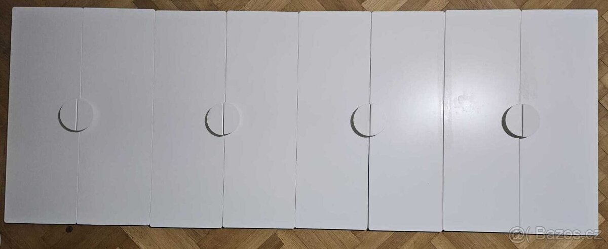 Nabízím dvířka (Ikea Smastad) ke skříni - 8ks. Bílá barva, rozměr 30 x 90 cm. Jedny dvířka mají z vnitřní strany zrcadlo. Desky mají kovové uchytky (Ikea Begripa) a jsou bez pantů. Původní cena desek a úchytek 4x(500+100) kč.