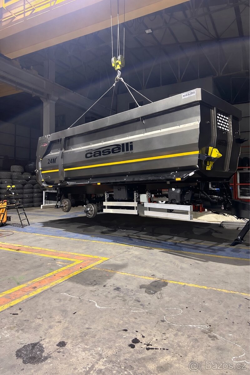 Nový traktorový vanový návěs Užitečná nosnost 15t Rozměr korby 6,5 x 2,4 x 1,7m Objem 24m3 bez nástavek Kola 600/50 - r22,5 Natáčecí vlečná zadní náprava Hydraulická opěrná noha K80 nebo otočné oko Podjezdové zábrany Zadní výsypné okno Konstrukční rychlost 40km/h Skříňka na nářadí, žebřík atd.