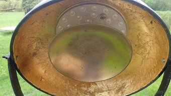 Autorský unikát-prototyp, interiérová, industriální, ateliérová. Silný LED zdroj 18W/4100K. Odrazná plocha reflektoru je pozlacena. Skutečným zlatem! Au fólie nedegraduje, drží na vstřikovaném Al odlitku speciálním lepidlem a jde opravit-doplnit, je-li třeba. Středový difuzor je na magnetu - odnímatelný při potřebě plného světelného výkonu. Můžete si ho nahradit třeba barevnými filtry, tkaninou pro měkké stíny při focení, atp. Bez nářadí jde oddělit parabolu od stativu jedním závitovým spojem (např. při přepravě, pro svícení "z ruky"). Boční matičky byly nahrazeny vroubkovanými kolečky průměru 20mm a stativ jde zajistit na pevné "rozkročení" drátěným trianglem. Každá noha tripodu je nezávisle výškově nastavitelná pro stabilitu i na nerovném podkladu, na schodech... Plastová rukojeť jde z paraboly odstranit - je na jeden šroubek. Lampa už bude mít trochu patinu, protože si ji manželka zamilovala a dala do svého pokoje ke čtecímu křeslu, ale vážnému zájemci ji prý ráda postoupí :-). Mohu