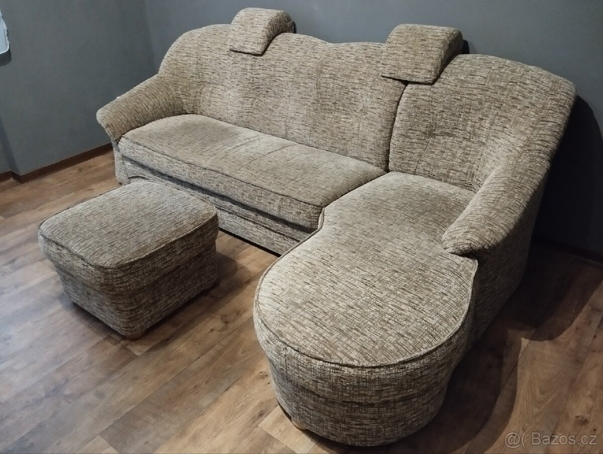 Prodám sedací souprava, rozměry 255x160x90cm, taburet rozměry 62x62cm.